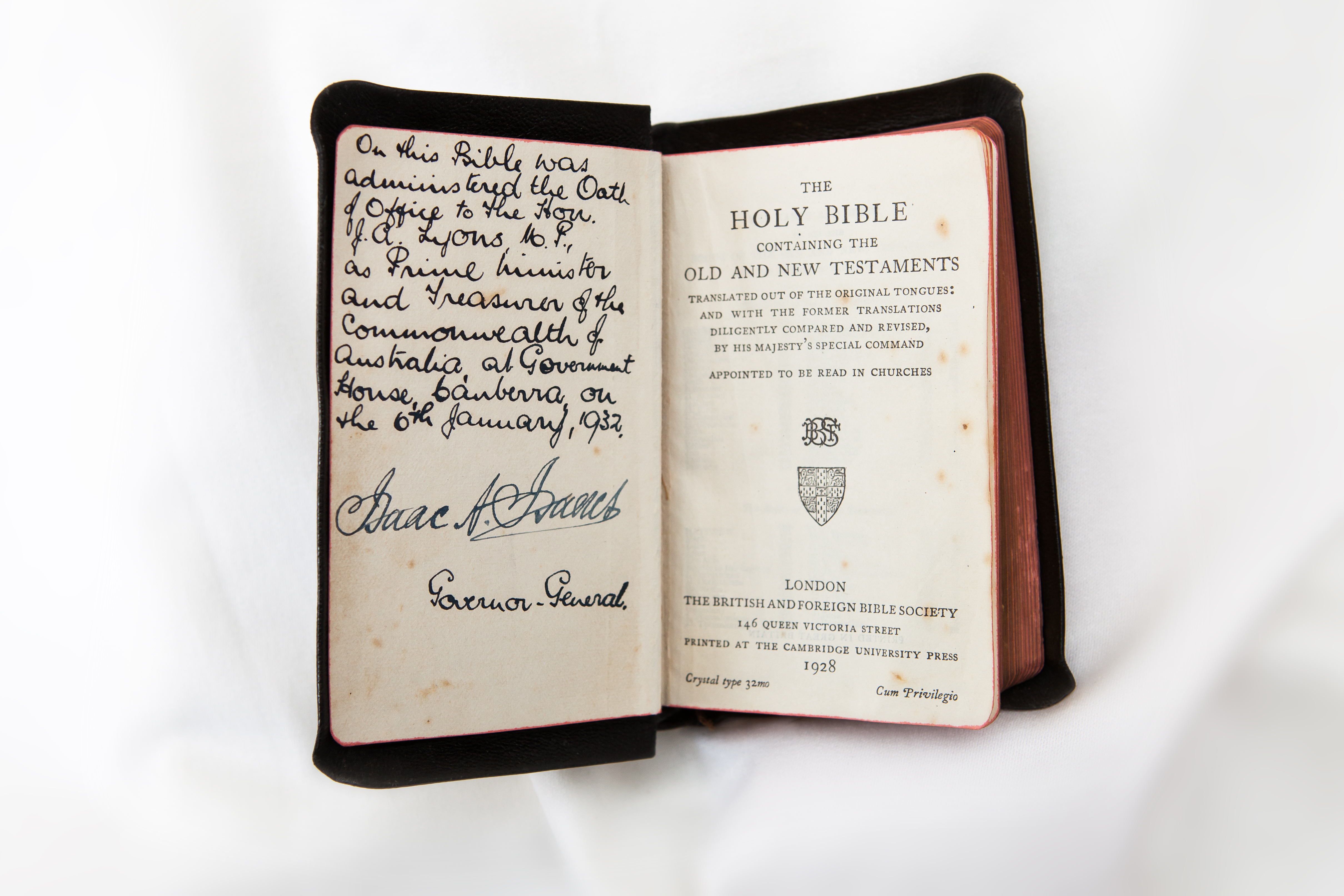 On this Bible was administered the Oath of Office to the Hon. J.A. Lyons, M.P. as Prime Minister and Treasurer of the Commonwealth of Australia, at Government House, Canberra, on the 6th January, 1932. Isaac A. Isaacs. Governor-General.