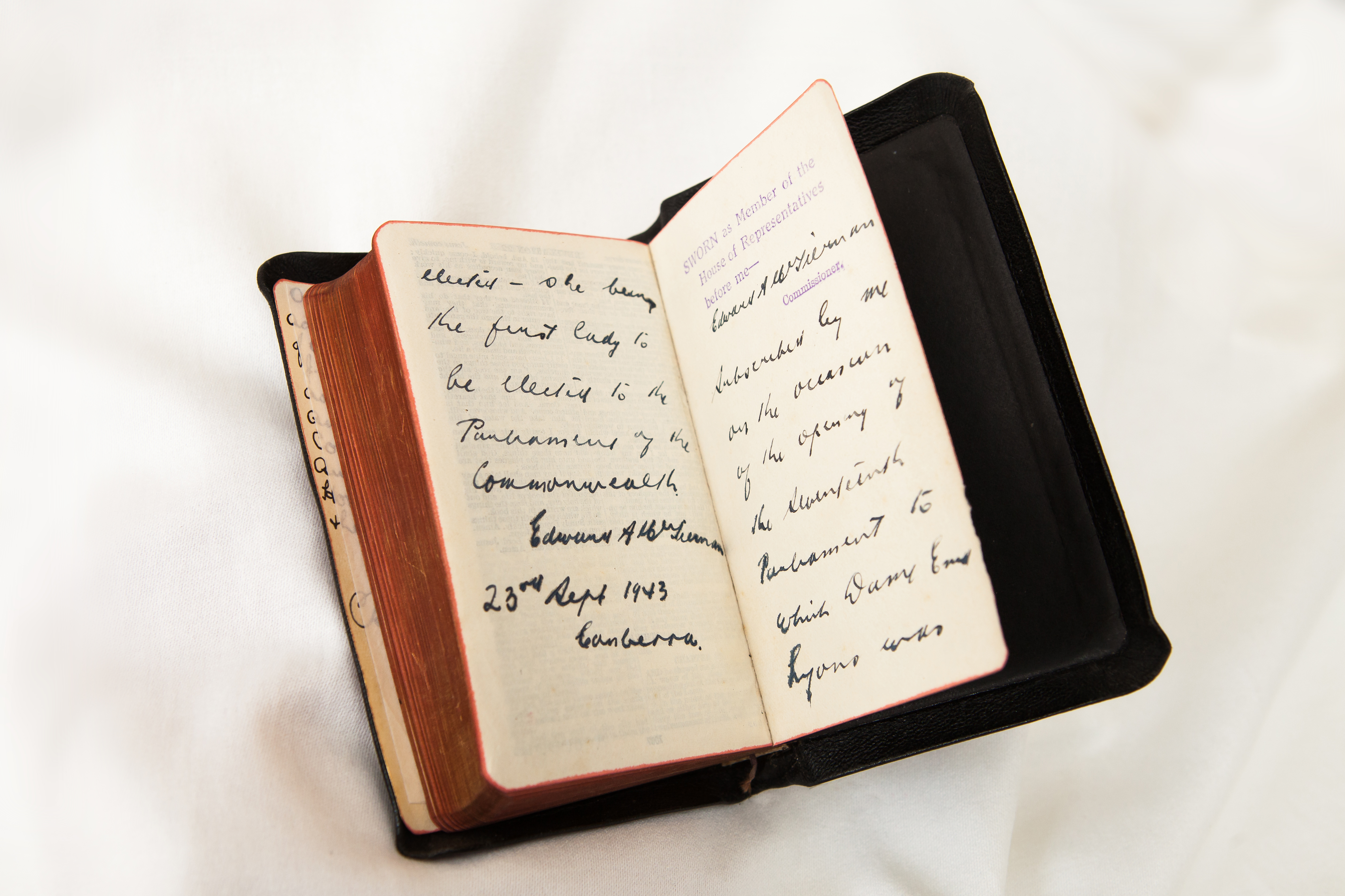 The same bible was used when it was Enid’s turn to be sworn in as a member of the House of Representatives, although its journey was not a simple one. Enid had tried without success to locate it for several years, but two weeks before the federal election of 1943 Reverend Patrick Lyons of St Patricks in Melbourne wrote to Enid stating that ‘I could find no trace of it until this week… perhaps it may be a good omen’. After her successful election, it was used on the 24th September 1943 to swear Enid in as the first female member of the House of Representatives.